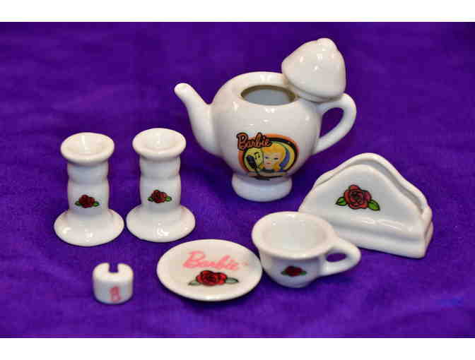 This 1994 Barbie ceramic "Solo in the Spotlight" tea set comes in its original beautiful velvet box. The set includes six three-piece place settings, a tea pot, sugar and creamer, and a serving tray. The Barbie set is new in the box.