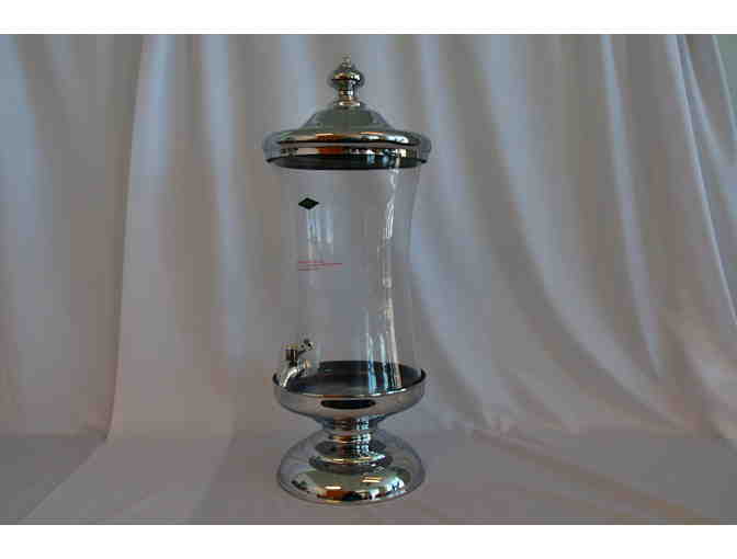 This Crystal Horizon chrome and glass beverage dispenser measures 9.5 inches in diameter and stands 22 inches high. It has a 2.5 gallon capacity, a quality stainless steel coated spout with a clearance of six inches, and may be used for cold beverages. The dispenser is a "must have" for family events and parties.