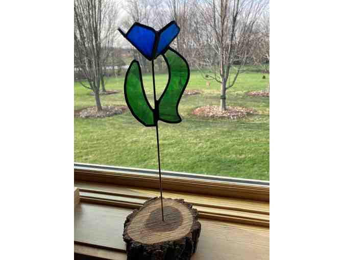 Enjoy this homemade stained glass flower in your outside garden or inside on the wood slice stand.  Flower is 14 by 3 ½ inches tall.  Wood slice stand is 4 ½ by 5 inches and 2 inches thick.