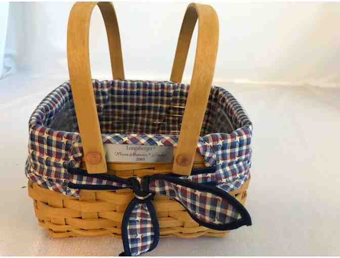 2003 Longaberger Woven Memories Homestead basket, liner, protector, 2 wooden swing handles. Basket is signed by 3 Longaberger family members; Jerry 3, Gary 10, and Carmen 11.