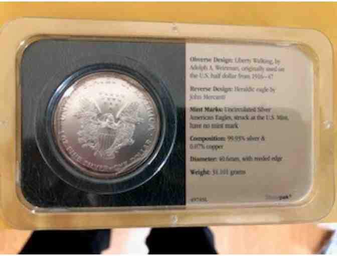 one troy ounce 2002 Silver American Eagle in a plastic case detailing facts about the coin.