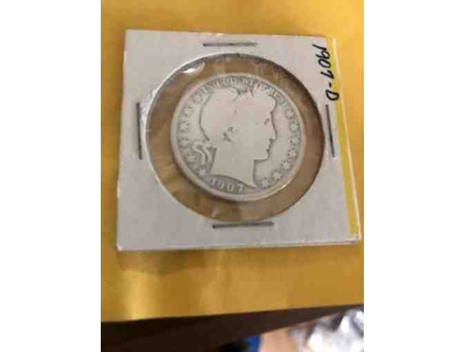 1907 - D (Denver mint) Barber half dollar. Barber halves were minted from 1892 -1915. This is a circulated coin and is housed in a 2 x 2 cardboard coin holder.