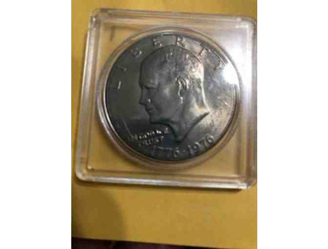 1976 bi-centennial clad dollar depicting president Dwight D. Eisenhower and the Liberty Bell. It is housed in a hard plastic container.