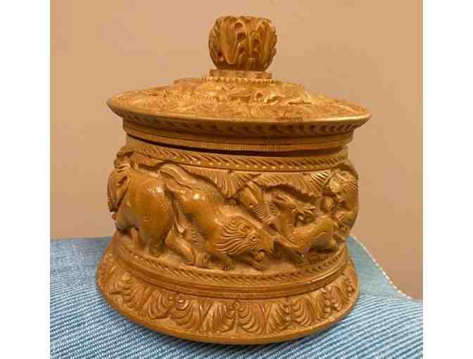 Vintage round light carved wooden trinket box, jungle animals carved in the wood, lions chasing an elephant and gnu deer-like animals.