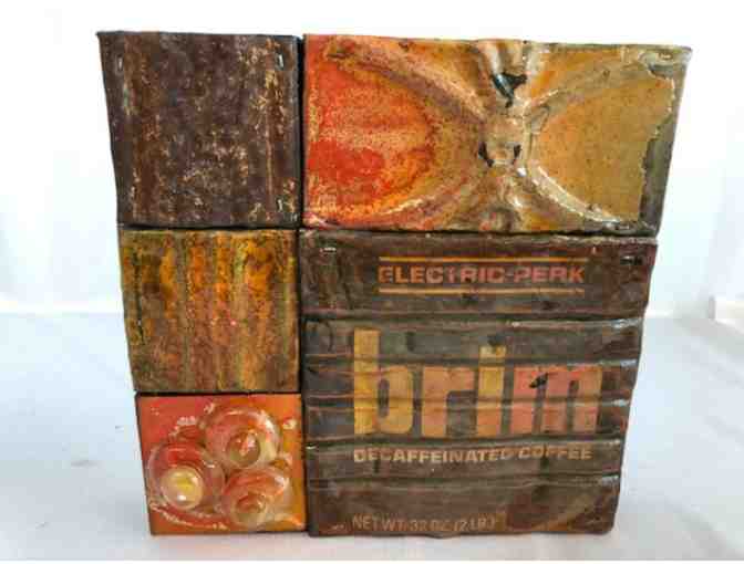 Local artist, Lori Daniels of Mapleton, has created this wonderful collage with five antique tin tiles in shades of orange, yellow, and brown. One of the squares features an extra artistic embellishment, and the main square is made from a Brim decaffeinated coffee tin. The piece measures 9 by 9 inches.