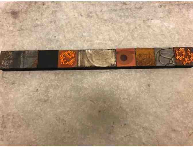 Local artist, Lori Daniels of Mapleton, has created this unique art work from painted antique tin tiles. Colors of orange and black are featured in this piece and two of the sections are embellished for extra depth and dimension. This work measures 30 by 3 inches and would add a touch of class to your decor.