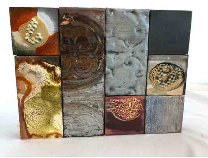 Local artist, Lori Daniels of Mapleton, created this wonderful collage using antique tins from the mid 1800's. The eight-piece collage showcases colors of gray, orange, green, brown, and tan. Two of the squares feature scroll designs and two are accented with embellishments. The piece measures 12 by 9 inches overall.