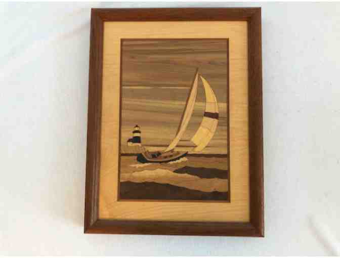 This Hudson River inlay by Nelson was crafted from a variety of woods including walnut, oak, beech, ebony, and more. Each carefully chosen piece was cut, assembled, and cemented as it was pressed into place. The piece is hand rubbed with teak oil for a beautiful finish. This inlay work measures 9.75 by 12.75 inches and is entitled "Spinnaker Point."