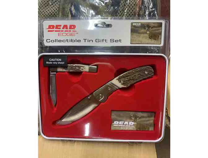 Perfect for hunters and collectors alike, the Bear Edge Two-Knife Collectible Tin Gift Set includes a 3.25” liner lock folder knife and a 2.25” gentleman’s pen folding knife. Each knife in the set features a 420 stainless steel, plain-edge blade; ambidextrous manual thumb-stud opening mechanism; and a Delrin imitation stag handle. Knives come prepackaged in a collectible tin featuring a whitetail deer scene. Lifetime warranty against defects in material or workmanship.