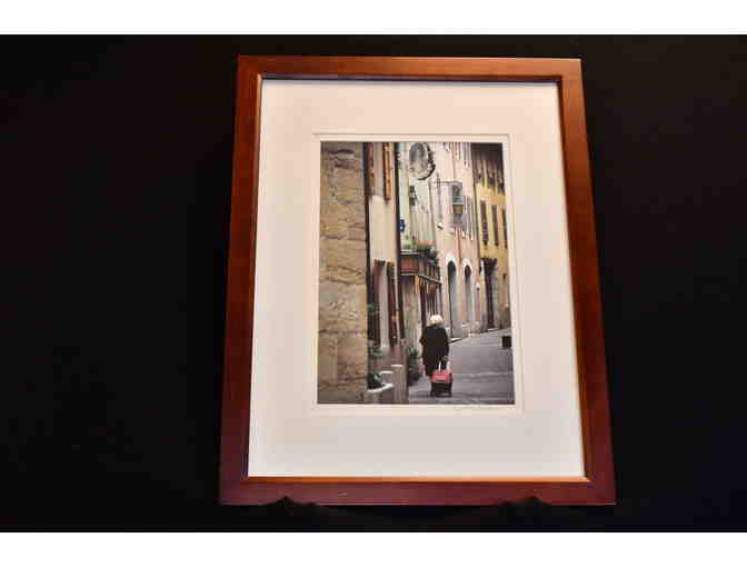 Photographer Cynthia Bridges took this wonderful color photo of a traveler walking down a paved street. The photograph is nestled in a brown frame and matted in off-white or cream. The frame measures 20 by 26 inches.