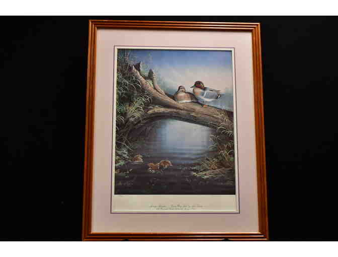 Ducks are sitting on a fallen log above the pond in this framed work by Sam Timm which was completed in 1991. Wisconsin Ducks Unlimited is the sponsor of this work that measures 30 by 24 inches in the wood frame with a lavender matte. The title of the print is "Spring Splendor."