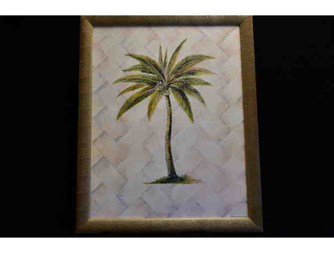 This framed poster depicts a palm tree on a cream lattice woven background. The silver frame measures 25.5 by 31.5 inches, and the piece is appropriately titled "Palm Tree."