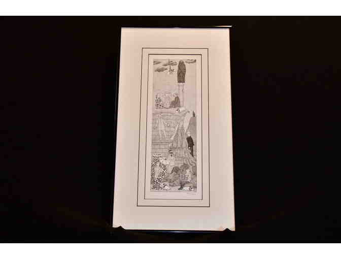 This limited edition black and white print by Edward Gorey is number 864 of 1750. The print measures 12 by 22 inches and is entitled "Tower Scene."