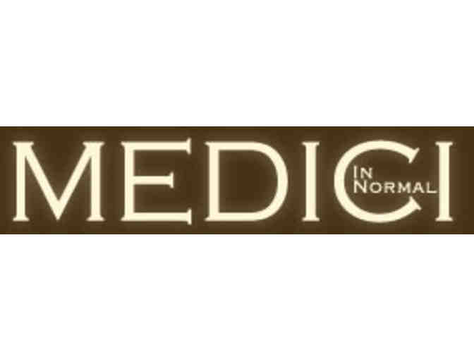 Enjoy a delicious dinner for two with this dining out gift certificate for either dining in or carry out at the Medici in Normal restaurant. The Medici opened this location in 2008 playing a vital role in the revitalization of the uptown commerce district. Everything is made fresh and in-house at Medici, including baked goods from their own bakery. The Medici prides itself on having an extensive craft beer list with 32 drafts on tap. Their rooftop outdoor dining is made comfortable with heaters for any time of the year. Enjoy!