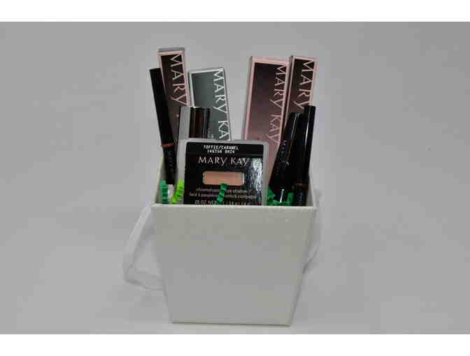 This basket of Mary Kay products includes a toffee color eye shadow, deep brown eye liner, black mini-lash intensity mascara, medium nude color lip liner, and pink cherie lipstick. You will also receive a gift certificate toward any future purchases of $40 or more.