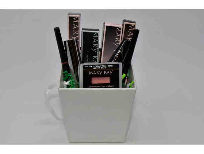 This fabulous cosmetics basket contains Mary Kay products plus a gift certificate. Goodies includes golden peach eye shadow, black eye liner, black min-lash intensity mascara, medium nude lip liner, and exotic mango lipstick. In addition, the gift certificate may be used toward a future purchase of $40 or more. Enhance your features with these wonderful Mary Kay cosmetics and you'll be glad you did.