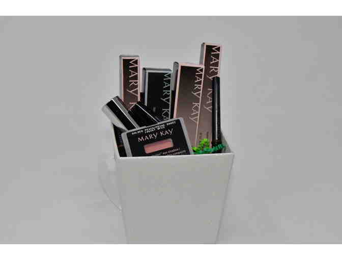 This basket of Mary Kay cosmetics includes golden peach eye shadow, deep brown eye liner, black mini-lash intensity mascara, deep nude lip liner, and chocolate lipstick. The basket also contains a gift certificate that may be used toward a future purchase of $40 or more. Choose Mary Kay. You will be glad you did.