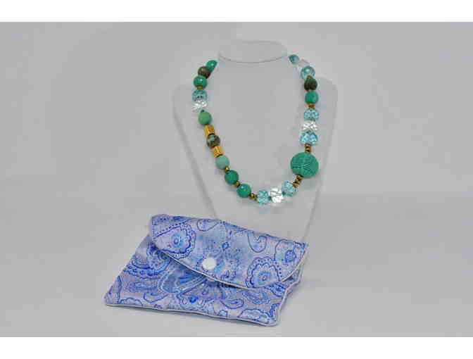 This hand crafted jade inspired costume necklace features beads in gold, green, clear, and blue with a relief carved Asian design. The necklace measures 19 inches and has a magnetci closure.