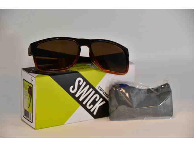 These Tifosi Swick Sunglasses are in a brown-fade design.  The Grilamid TR-90 frame is light and durable nylon, and the polycarbonate lenses are scratch resistant and shatterproof.  They offer 100% UVA / UVB protection keeping harmful rays from your eyes. The glare guard reduces eye strain, and the hydrophilic rubber grip hangs tight as you sweat.  They come with a lifetime warranty against manufacturer defects and a gray knit drawstring pouch. For men or women.