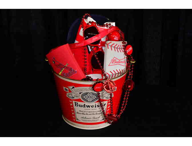 Budweiser basket containing t-shirt, hat, cozies & other fun branded items. Also includes a pair of St.Louis Cardinal's Green Seat (Cardinal's Club) tickets.These 2021 tickets are located three rows behind home plate. Tickets are all-inclusive including access to the VIP air-conditioned Cardinal's Club as well as complimentary in-seat wait service through out the game, full bar, upscale all-you-can-eat buffet, private restroom w/attendant. Also includes VIP parking pass in Busch Stadium's premier parking lot.