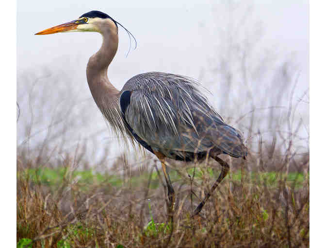 On a crisp, cloudy morning I drove around the auto-route of the Colusa National Wildlife Refuge with a friend. Driving along a narrow dirt road, we spied a large Great Blue Heron standing on a levee across a narrow canal. The gentle low light allowed me to get a nice close-up that showed very clearly the detailed and delicate feathers of this magnificent bird.