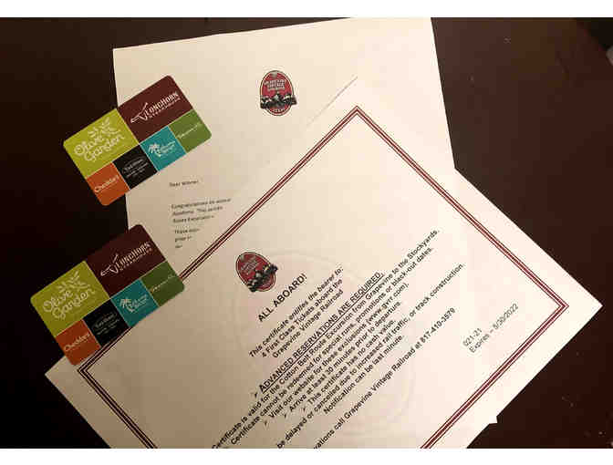 certificate for four (4) first-class tickets during our regularly scheduled Cotton Belt Route Excursion which travels from Grapevine to the Fort Worth Stockyards and two $25 Olive Garden or Darden restaurant gift cards.