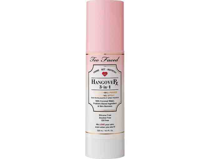 What is it? Too Faced Hangover 3-In-1 Replenishing Primer & Setting Spray is a weightless 3-in-1 coconut water-infused mist that primes, sets, and refreshes makeup while it helps keep skin hydrated.