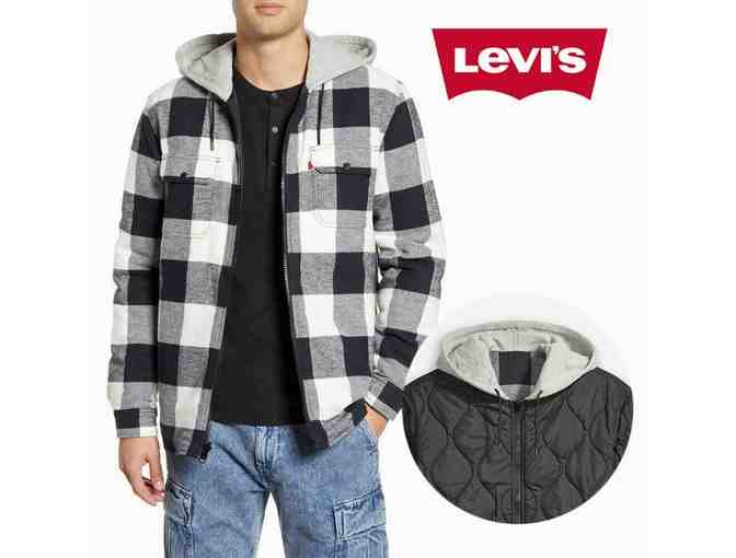 BLACK AND WHITE FLANNEL PLAID JUSTIN TIMBERLAKE COLLECTION LEVIS HOODY. MENS SIZE LARGE. REVERSIBLE