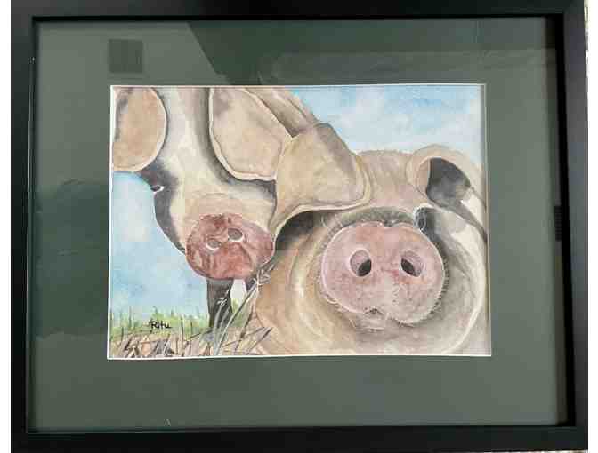 Whimsical original watercolor painting by Park parent, Ritu Singh. This beautiful 10x14 painting comes framed and is a wonderful addition for viewers of all ages but especially those who may enjoy farm animals and those with younger children...