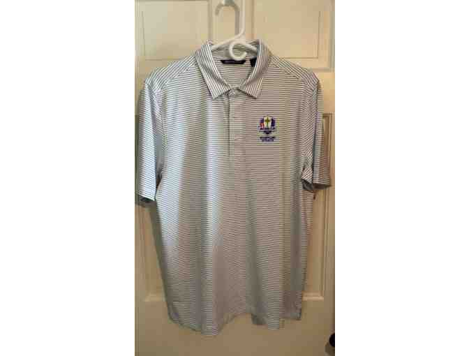 CUTTER AND BUCK WHITE AND NAVY PINSTRIPE MENS SHORT SLEEVE SIZE MEDIUM GOLF POLO. RYDER CUP 2020-21 WHISTLING STRAITS, DRYTEC 50 UPF+