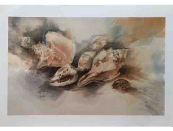 This watercolor painting of seashells is by Award Winning Artist Ruth Rea. Ruth was a talented artist working in the medium of watercolors. For many years she painted a watercolor scene for the Society of the Blind's annual Christmas card. She was very fond of her home in the Bahamas. Ruth Rea was grandmother of Scarlett and Avery Rea.