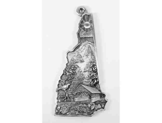 PLUS! A New Hampshire-made ornament with traditional symbols of what makes New Hampshire a special place to live and visit. Made of lead-free pewter by Hampshire Pewter of Somersworth, New Hampshire, it is 3 inches high x 1-1/2 inches wide and includes a red cord for hanging.