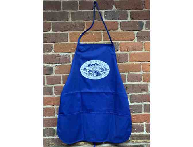 Get ready for backyard barbecue season! This blue apron features the NH Preservation Alliance logo, and has two large front pockets and a tie back. Machine washable.