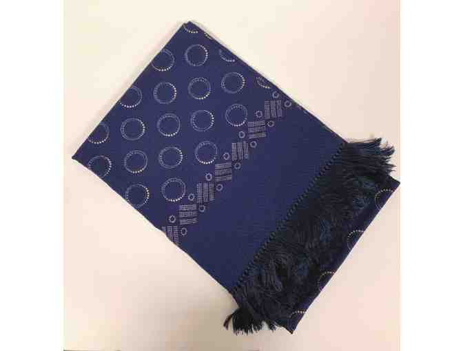 Luxurious, silky vintage scarf with original label: "Made in England for Abercombie & Fitch Co. New York."  Deep navy color with cream-colored pattern, and deep fringe.