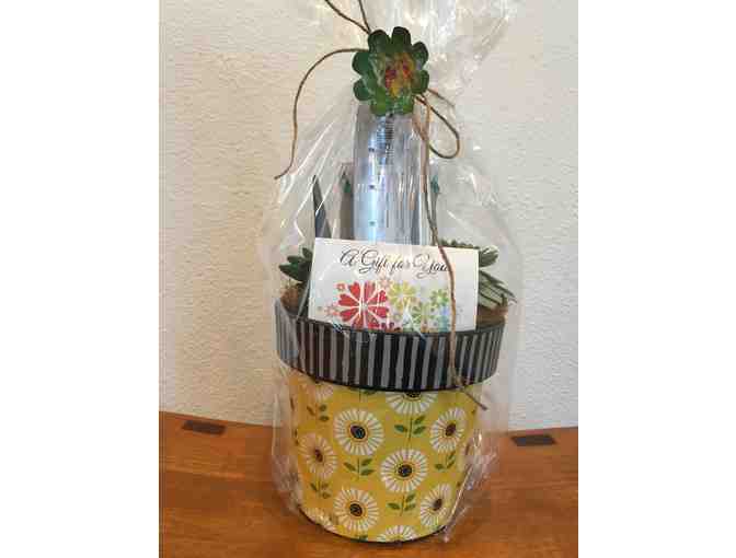 Beautiful gift basket containing garden tools, gloves, art pot, 2 small artificial succulents, and $50 gift card from Eagle Crest Nursery