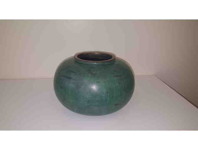 Bronze vase with antique verde patina and brass trim.