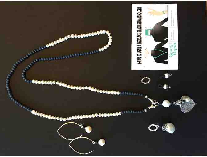 Combination necklace or mask holder with sterling silver Aspen leaf, ring for multi use, freshwater pearl drop and matching freshwater pearl earrings