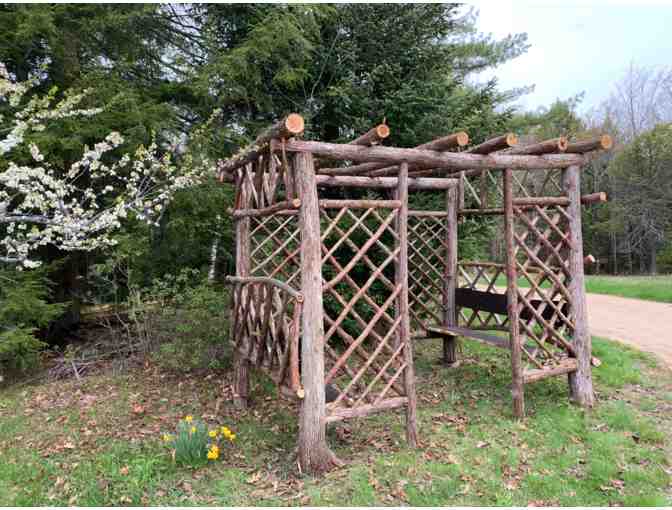 Imagine this rustic pergola iin your garden, field, or wooded landscape. Designed and built exclusively for the Preservation Alliance auction by highly regarded timber framer Steve Fifield. Two built-in benches along sides of interior. A truly unique addition to any property!