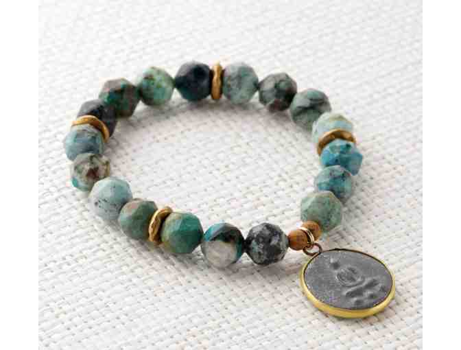 A 7" chrysocolla, jasper, and brass bracelet with a stone Buddha charm.