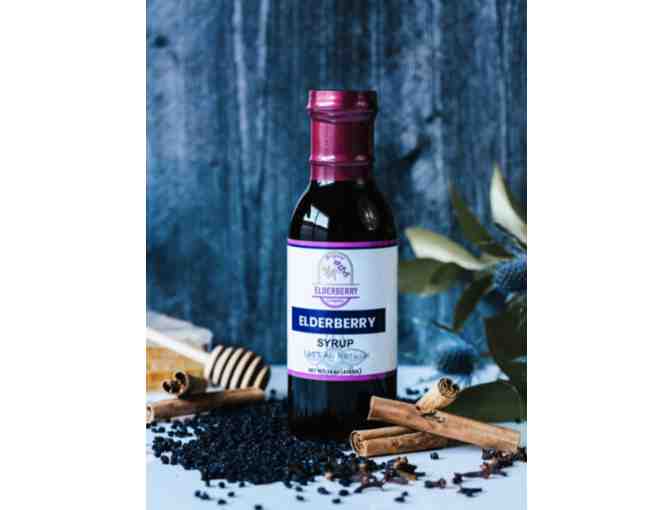 A gift basket from Original Elderberry Company containing one 14oz bottle of elderberry syrup and one 2oz bottle of ElderberryOn.The.Go. concentrated syrup.
