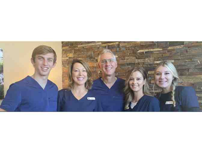 A gift basket containg a ceritficate for $750 off of a full orthodontic and whitening treatments and a waterpik.