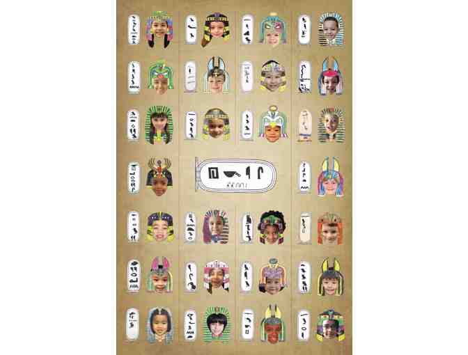 Since the beginning of the school year, our class children have been gathering extensive knowledge about the civilization of Ancient Egypt and have been talking excitedly about pyramids, pharaohs and mummies. The Kindergarteners dived into the Egyptian mythology and learned about gods and symbols. Recently they even mastered writing their names in hieroglyphs and created their unique cartouches. So there was no doubt when we decided to capture the moment and created a photo collage that the children would enjoy looking at every day, remembering their adventurous first year at HCES. The collage is a collection of their handwritten cartouches and their smiley faces, adorned with the masks and headdresses they personally selected and colored. The photo collage is custom printed on a 20”x30” specialty wood and will be delivered to the lucky high bidder.