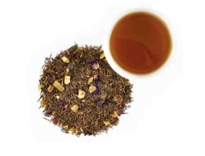 A gift basket from The Spice and Tea Exchange including an infuser-and-mug combination; 1 oz packages of Blood-Orange Smoothie, Creme Brulee, and Hazelnut Cookie teas; a 1.5 oz package of Florida Sunshine sugar; and a 0.75oz Barter Box of Peppermint Patty sugar.