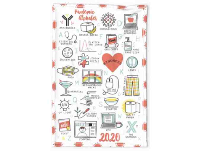 A hand-made tea towel commemorating the ABCs of COVID in linen cotton canvas, 16" x 24".