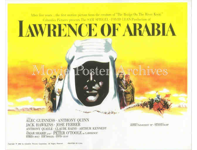 Lawrence of Arabia, the classic 1962 David Lean British WWI desert adventure starring Peter OToole, Alec Guinness, Anthony Quinn, Omar Sharif, Jack Hawkins, Jose Ferrer, Claude Rains, Anthony Quayle, Arthur Kennedy and Donald Wolfit.