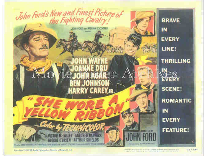 She Wore a Yellow Ribbon, the classic 1949 John Ford calvary western starring John Wayne, Joanne Dru, John Agar, Ben Johnson, Harry Carey Jr., Victor McLaglen, Mildred Natwick, George Obrien, Arthur Shields and Michael Dugan.