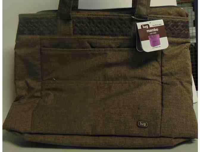 LUG sun tote is 19"wx15"tall and has 2 inside zipper pockets and 3 smaller pockets; key ring holder, and front has 2 zipper pockets and one open one. Back has one large zipper pocket.