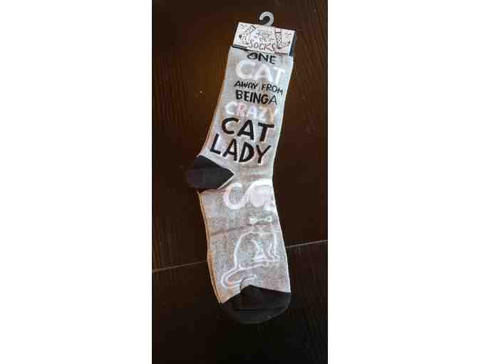 Primitves by Kathy, cute cat socks: " One cat away from being a Crazy Cat Lady". Donated by Helen Melichar.