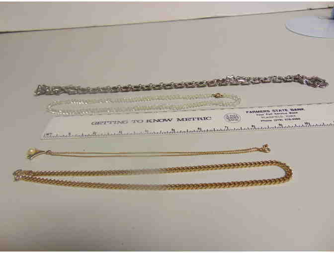 Very old vintage Jewelry: 4 Necklaces; one beaded; two chain; one 'pearl look' necklaces.