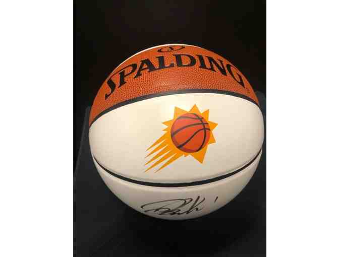 Bid now to win this Spalding basketball autographed by Suns All-Star guard Devin Booker. The basketball is leather with white signature panels and the Suns logo.